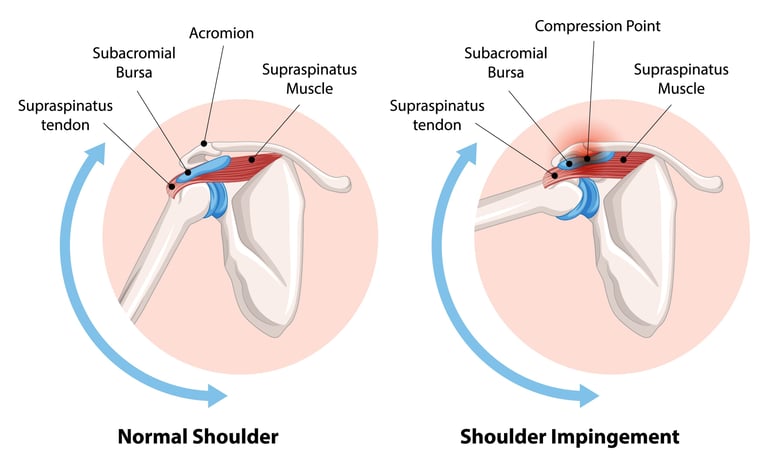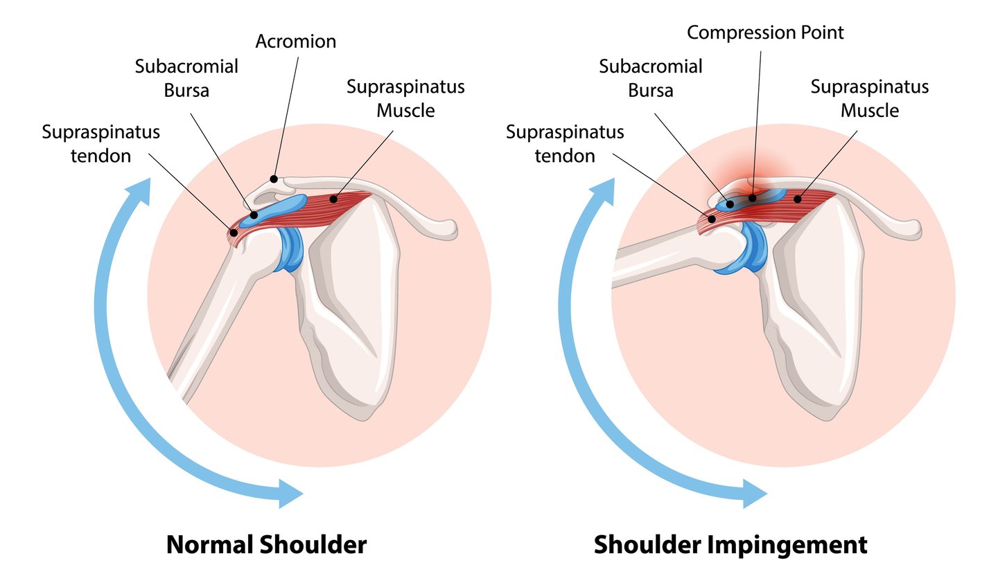 The rotator cuff sits under a bony roof near the top of your shoulder (the acromion). When the tendons and the small fluid-filled cushion (bursa) are irritated or overloaded, this can cause pain — especially when you lift your arm up or out to the side.